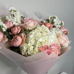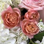 Wrapping - 1 pce hortensia blanc - 3 pce spray de roses julieta - 3 pce matthiola blanche - 2 pce rose de jardin rose o'hara - 4 pce