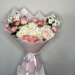 Cette composition exquise présente des hortensias blancs immaculés et de délicates roses rose pâle, soigneusement cueillis à la main et artistiquement disposés dans un emballage rose pâle.