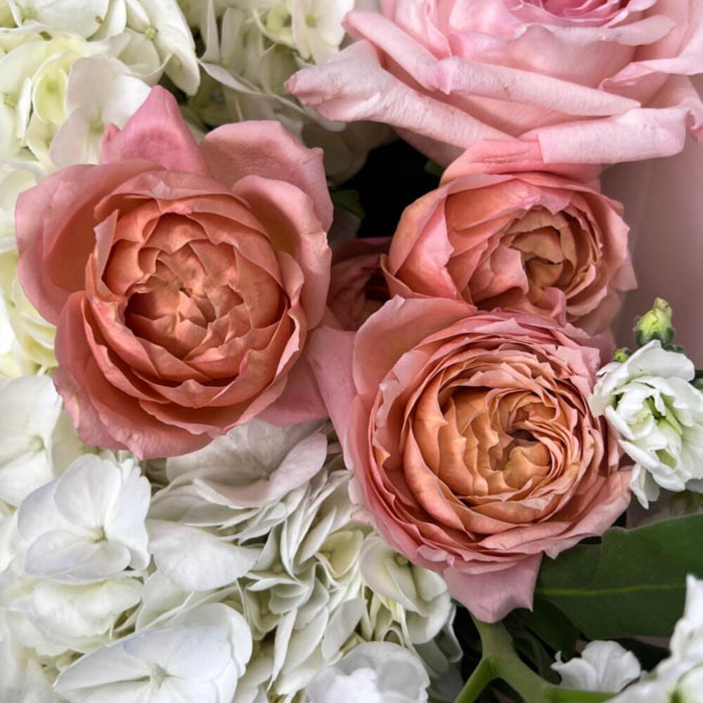 Wrapping - 1 pce hortensia blanc - 3 pce spray de roses julieta - 3 pce matthiola blanche - 2 pce rose de jardin rose o'hara - 4 pce