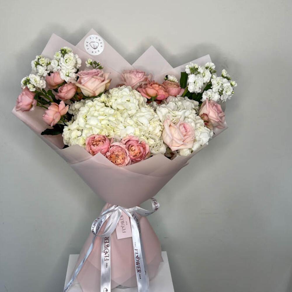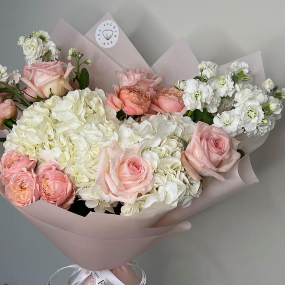 Cette composition exquise présente des hortensias blancs immaculés et de délicates roses rose pâle, soigneusement cueillis à la main et artistiquement disposés dans un emballage rose pâle.