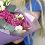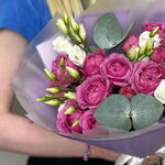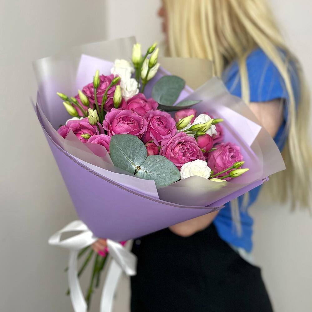 Satin ribbon - 1 pce Eustoma - 3 pce julietta cerise - 3 pce design packaging - 1 pce eucalyptus - - 2 pce