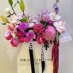 C'est une superbe composition florale présentée dans un sac chic Brillante Flowers. Le bouquet propose un délicieux mélange de tons roses et violets avec des fleurs abondantes comprenant des lys, des roses, des œillets, des chrysanthèmes et des pompons. Des touches douces de lilas et de vert ajoutent équilibre et profondeur, tandis que l'amaranthe retombante lui confère une allure dramatique et élégante. L'emballage façon dentelle renforce son esthétique sophistiquée et moderne — parfait pour offrir lors d'occasions spéciales ou comme pièce maîtresse décorative.