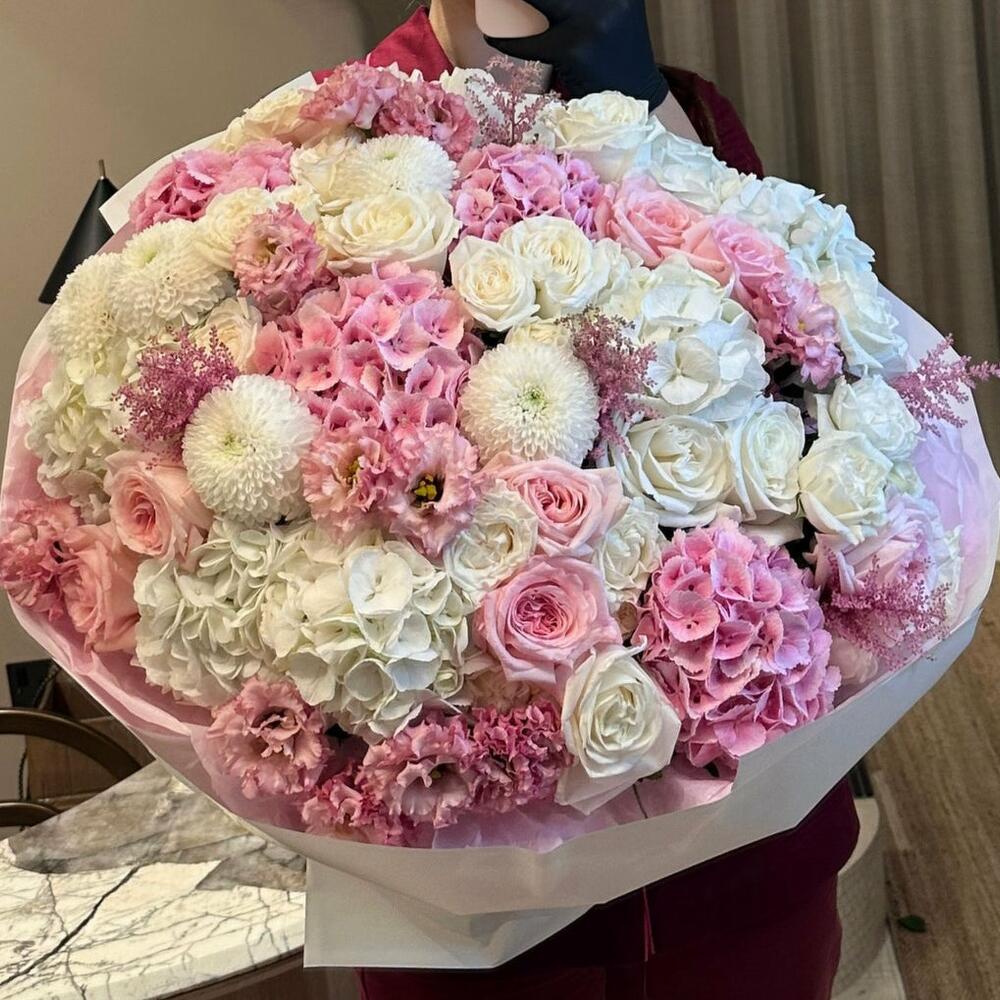 Lisianthus - 5 pce astilbe - 5 pce white hydrangea - 5 pce pink hydrangea - 5 pce œillets roses - 10 pce pink roses - 15 pce roses blanches - 10 pce chrysanthème blanc - 6 pce