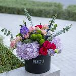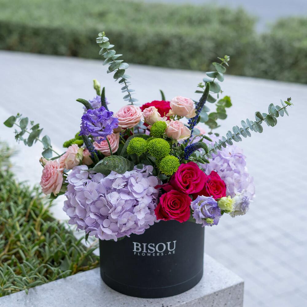 Composition en boîte de 2 tiges d'hortensia violet, 5 tiges de roses fuchsia, 5 tiges de roses spray roses, 5 tiges de véronique bleue, 3 tiges de chrysanthème vert, 3 tiges de lisisnathus violet dans une boîte noire