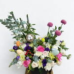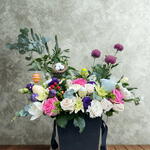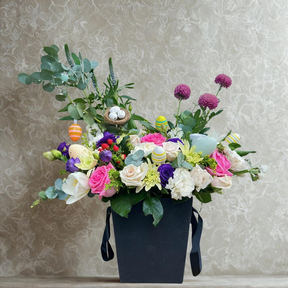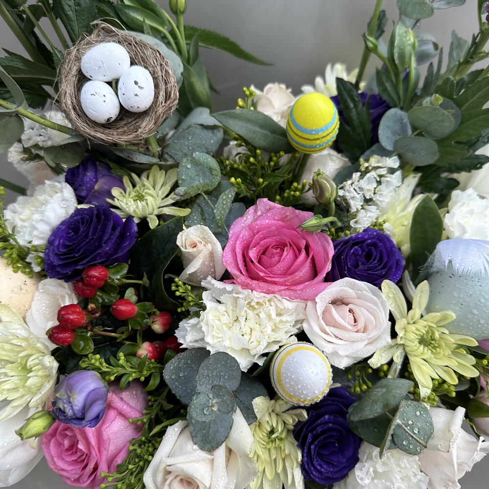 Box - 1 pce Pink rose - 3 pce White rose - 4 pce tulipe blanche - 2 pce lisianthus violet - 3 pce white carnation - 5 pce chrysanthème blanc - 2 pce fleurs d'appoint saisonnières et douces - 5 pce pompon - 3 pce nid d'œufs - 1 pce œufs de Pâques pastel - 5 pce