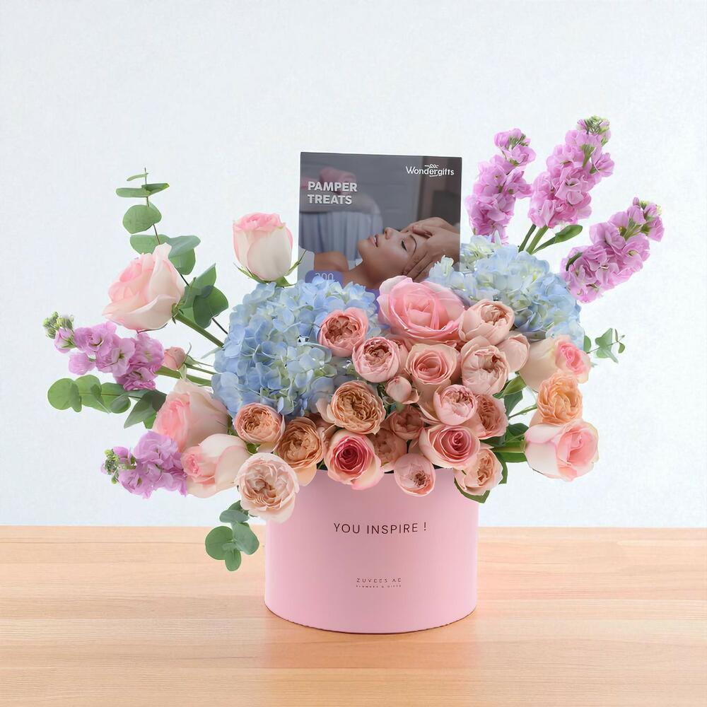 hortensia bleu - 2 pce tiges d'eucalyptus - 3 pce mathiola rose - 5 pce esperance roses - 8 pce roses juliet pêche - 5 pce coffret cadeau de soins et gourmandises - 1 pce