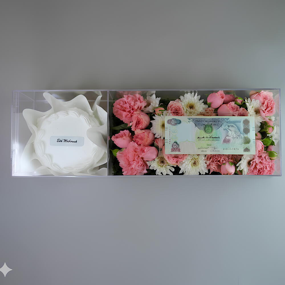rose - 5 pce œillets roses - 6 pce Gérbera blanche - 7 pce cake - 250 pce rose bébé - 5 pce mini chrysanthèmes blancs - 3 pce