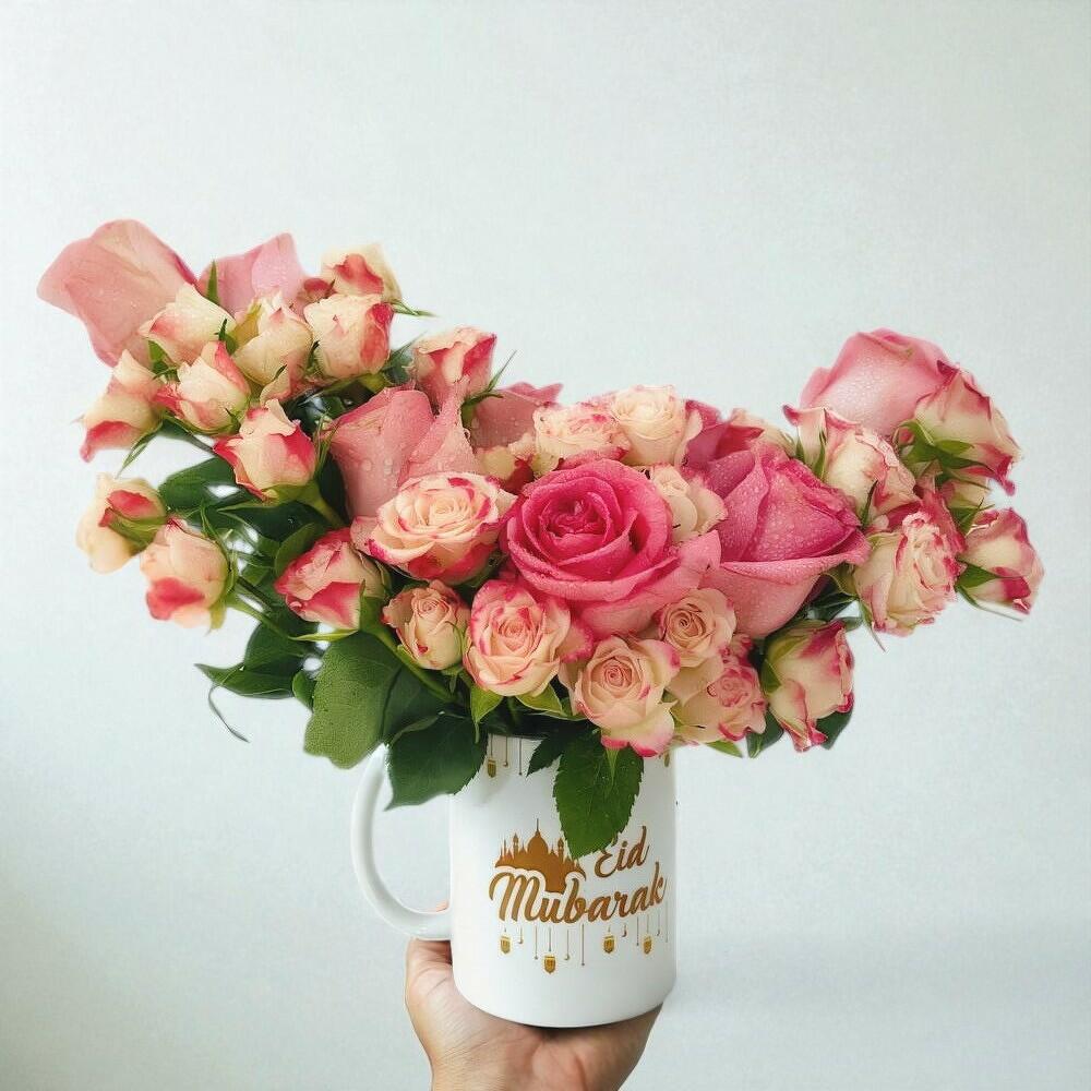 Célébrez l'Aïd avec cet arrangement délicieux de roses rose pâle et crème, joliment présenté dans une tasse festive “Eid Mubarak”. Le mélange de roses classiques et de roses spray crée un rendu luxuriant et romantique, idéal pour offrir ou pour ajouter une touche de joie à votre intérieur. Compact mais élégant, c'est un rappel attentionné d'amour, de gratitude et de bénédictions pendant la fête. Pour garder les fleurs fraîches, il suffit de remplir la tasse avec de l'eau propre chaque jour, de recouper les tiges tous les quelques jours et de les placer à l'abri de la lumière directe du soleil. La tasse en céramique réutilisable constitue un souvenir durable, garantissant que votre cadeau continue d'apporter de la joie longtemps après que les fleurs se soient fanées.
