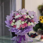 Pink rose - 6 pce White rose - 5 pce Chrysanthème blanc - 2 pce rose violette - 5 pce limonium violet - 3 pce emballage violet - 5 pce chrysanthème rose et violet - 3 pce rose layette et blanc - 3 pce ruban en satin violet - 1 pce lisianthus blanc - 2 pce