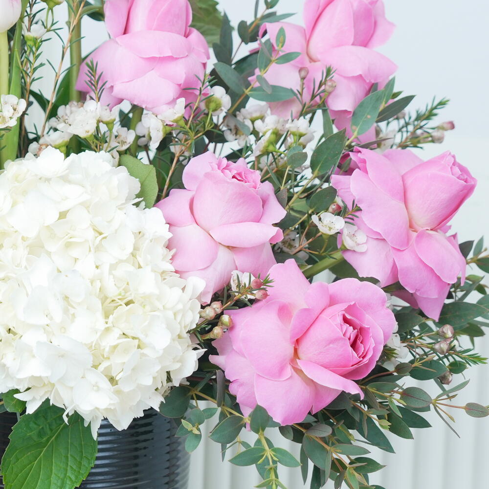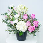 Bask in the enchanting delicacy of our unique Florists Special, a premium floral ensemble designed to embody grace and sophistication. This floral arrangement comprises two full-bloomed white hydrangeas, their snowy beauty elegantly matched by the dazzling innocence of five white carnations. Added to this serene mix are feminine pink roses, each petal exuding an alluring whisper of five pieces and six enchanting tulips gleaming in the same breathtaking hue. For added charm, our florists have slipped in two slender stems of pearly White Wax Flower and a single stem of the exotic Parviflora. The song of Jamaica, is echoed through two of its vibrant green stems anchored in this arrangement. This exceptional blend of soft colors and varying textures make this bouquet a delightful expression of adoration, sure to invoke joy and elegance.