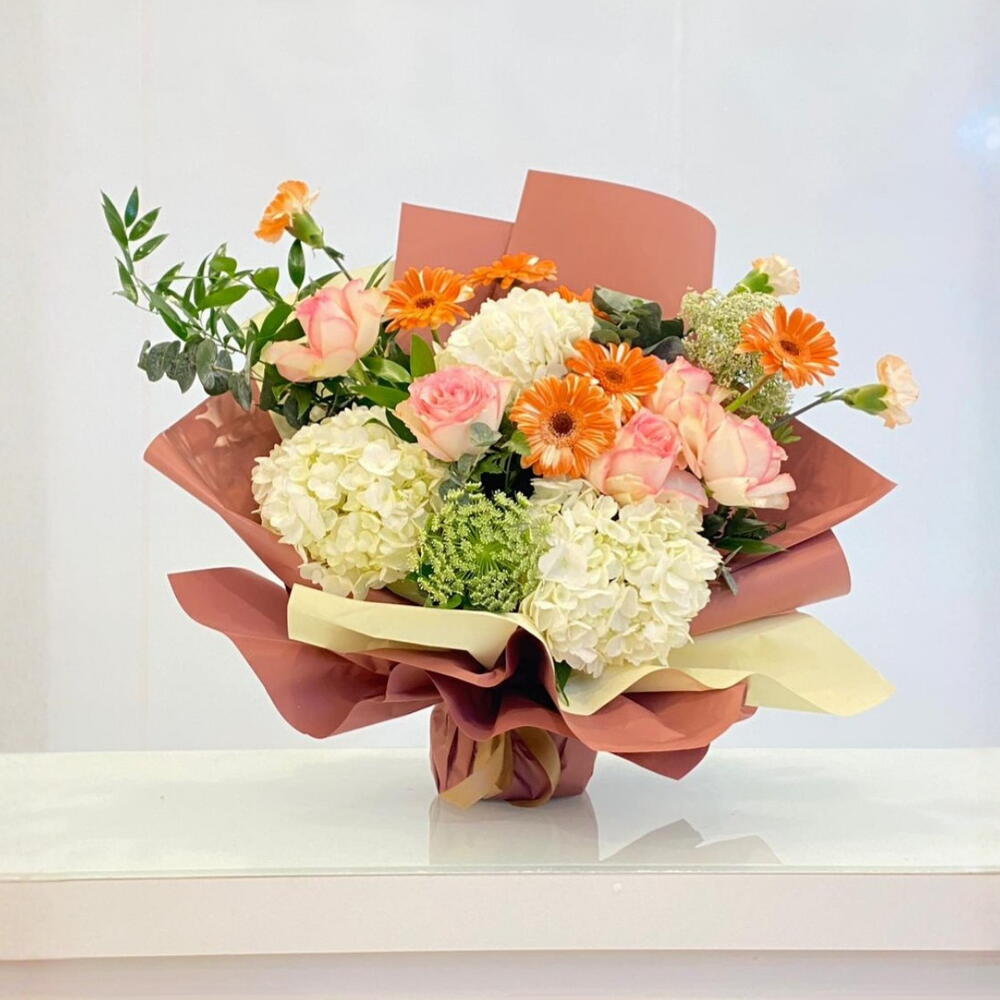 Eucalyptus - 3 pce feuilles de ruscus italien - 2 pce hortensia blanc - 3 pce gerbera orange stérilisée - 6 pce rose esperans rose - 5 pce feuilles immi - 2 pce
