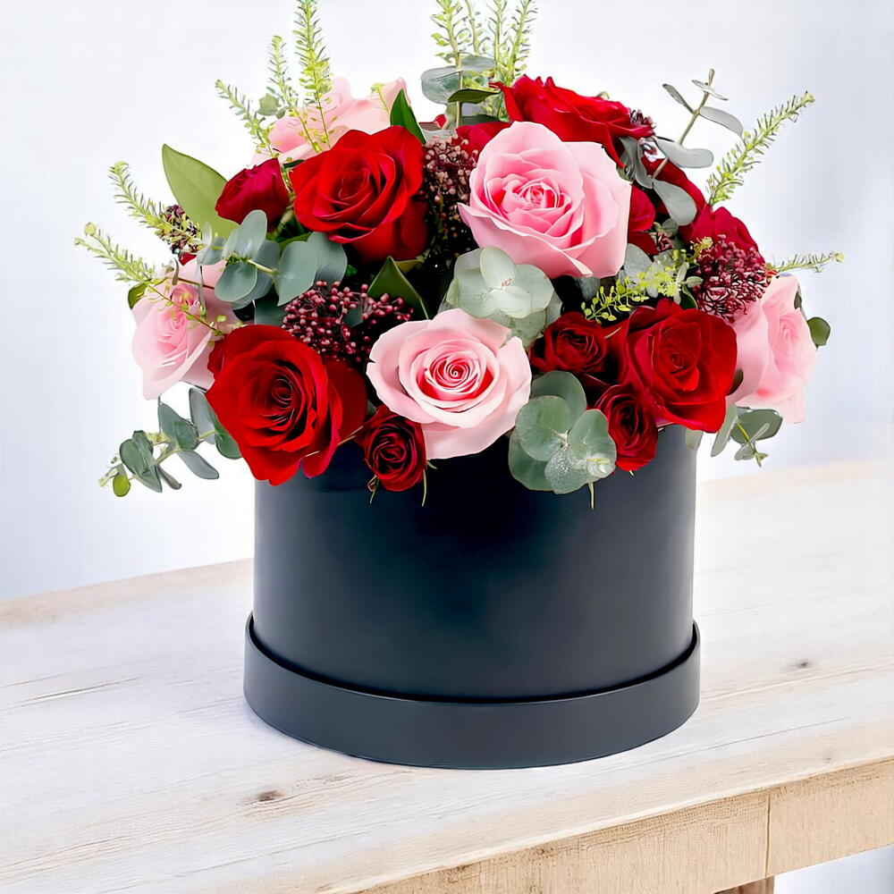 Niché dans une boîte à chapeaux noire et sophistiquée, l'arrangement est équilibré par des feuillages sauvages et des baies texturées pour une ambiance romantique contemporaine. Parfait pour des célébrations intimes, la Saint-Valentin ou comme centre de table pour des événements haut de gamme.