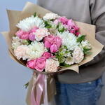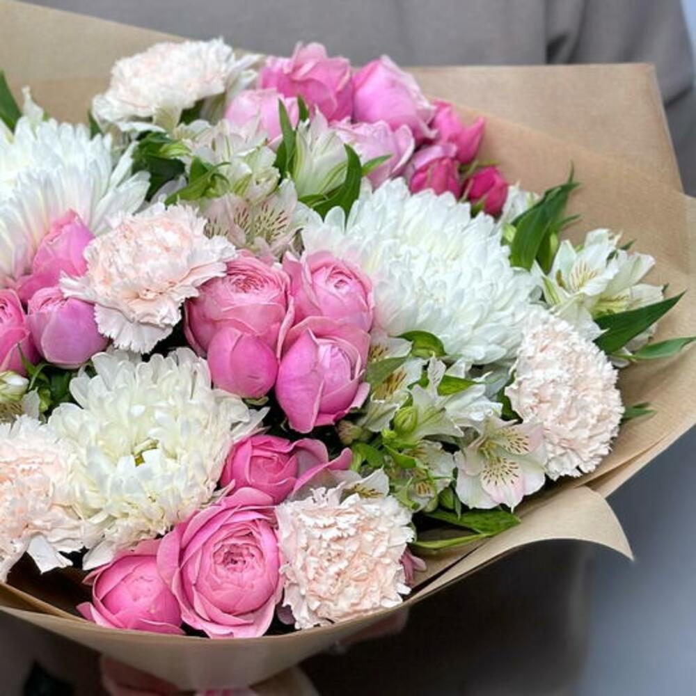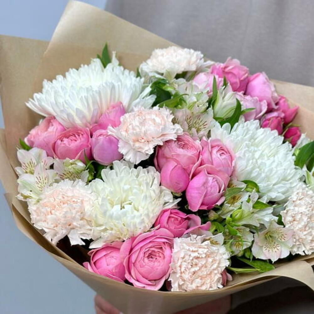 alstroemeria white - 5 pce papier kraft - 1 pce chrysanthème blanc à tête unique - 3 pce œillet crème brut - 5 pce spray pivoine rose silva rose - 4 pce