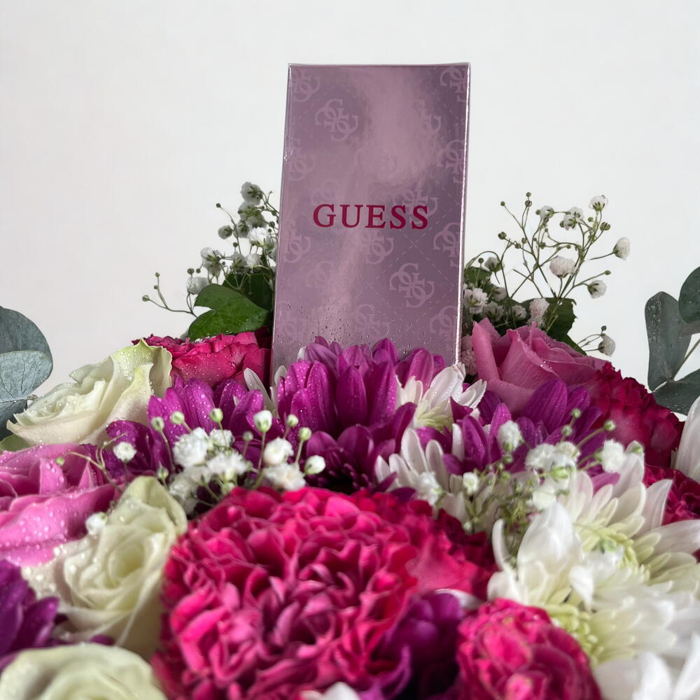 Pink rose - 4 pce White rose - 4 pce chrysanthème blanc - 2 pce chrysanthème rose - 3 pce eucalyptus leaves - 1 pce rose en spray rose foncé - 3 pce bâton de plâtre - 2 pce parfum Guess - 1 pce