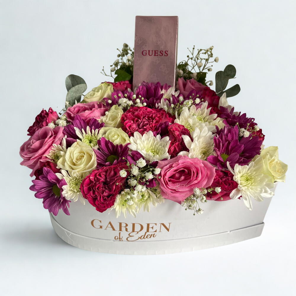 Plongez ses sens dans un univers de pure sophistication. Ce luxueux coffret cadeau, confectionné à la main, mêle des roses rouges veloutées, des chrysanthèmes rose tendre et des brins d'eucalyptus frais – chaque fleur étant cueillie à pleine maturité. Au cœur de ce bouquet se cache un flacon d'Eau de Parfum Guess, qui imprègne l'ensemble d'une aura féminine et intemporelle. Emballé dans du lin doublé de satin et orné d'un ruban or nacré, ce présent respire l'élégance avant même d'être ouvert. Que ce soit pour célébrer un anniversaire, un anniversaire important ou simplement pour faire plaisir, ce coffret transforme un jour ordinaire en un souvenir impérissable, à l'image d'un parfum délicat. Pourquoi elle l'adorera Roses et chrysanthèmes 100 % frais de la ferme Parfum signature Guess (Eau de Parfum) offert Livraison le jour même à Dubaï, emballage éco-responsable Message manuscrit offert Amour. Beauté. Un héritage – scellé dans un coffret inoubliable.