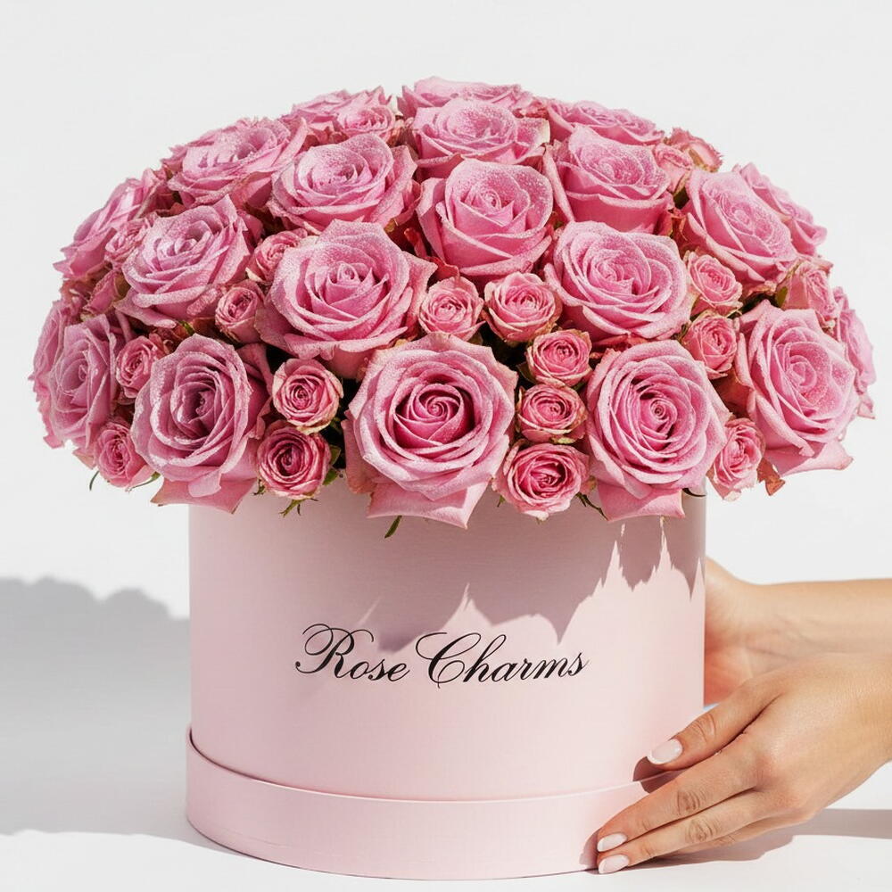 Un arrangement charmant de 21 roses roses et de 6 roses spray, magnifiquement présenté dans une boîte rose. Parfait pour exprimer l'amour, l'admiration et une élégance délicate.