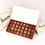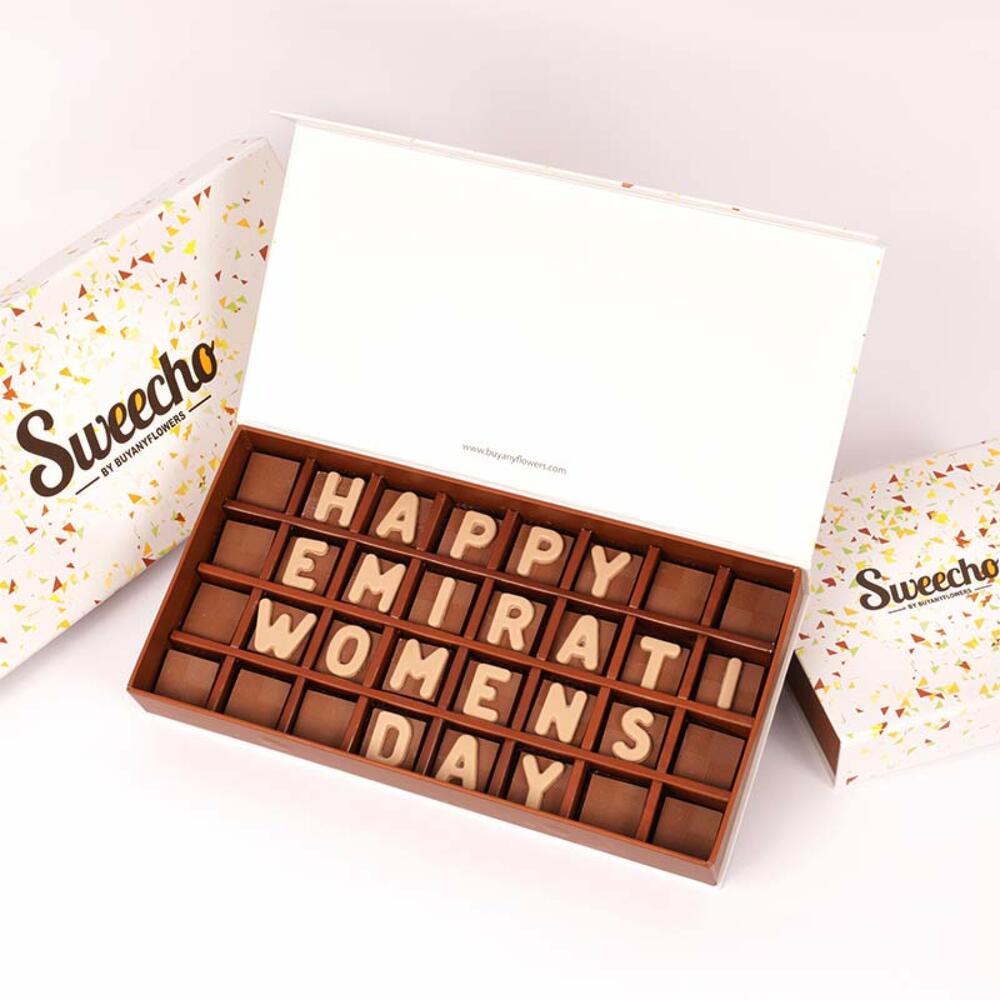 Marque - Sweecho, Texte - Bonne Journée de la femme émiratie, Type - Chocolat au lait, Quantité - 32 pièces, Saveur des lettres - Marbre, Saveurs assorties - Pistache, Cheesecake, Cacahuète, Caramel et Gaufrettes, Allergènes - Noix et lait, Disposé dans une belle boîte cadeau.