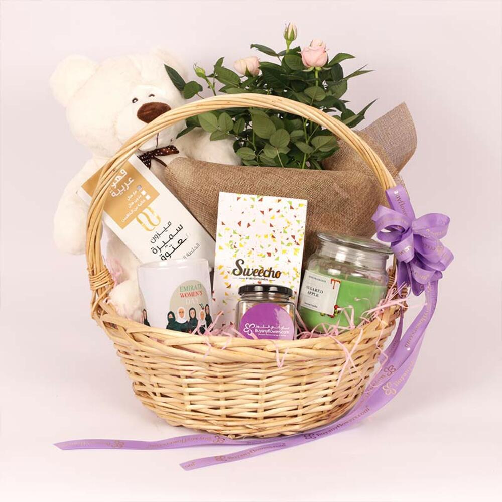 café arabe 100 g - 1 pce bougie parfumée en pot en verre - 1 pce chocolats assortis premium par sweecho 100 g - 1 pce tag femmes des émirats - 1 pce peluche 30cm - 1 pce mug à café imprimé pour la Journée des femmes émiraties - 1 pce noix de cajou rôties 100 g - 1 pce rosier rose - 1 pce grand panier beige avec anse - 1 pce décoré d'un nœud de ruban et de papier déchiqueté. - 1 pce
