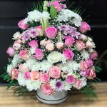 Un charme délicat rencontre une élégance gracieuse dans cet arrangement floral aux tons pastel, conçu pour apporter joie et douceur à n'importe quel espace. Composé d'un mélange enchanteur de roses, de lys et de chrysanthèmes dans des nuances de rose, de lavande et de blanc, ce bouquet dégage féminité et sérénité. Disposé dans une élégante boîte à chapeaux, il constitue un cadeau attentionné pour les anniversaires, les anniversaires de mariage ou simplement pour exprimer de l'affection. Pour une meilleure longévité, gardez l'arrangement dans un endroit frais, à l'abri de la lumière directe du soleil, et vaporisez légèrement les fleurs pour préserver leur fraîcheur. Coupez les tiges apparentes si nécessaire et renouvelez l'eau du support en mousse florale tous les deux jours.