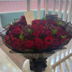 Ruscus - 8 pce carnation - 5 pce hortensia - 2 pce roses - 12 pce spray roses - 5 pce gérbera - 5 pce bottons - 5 pce chrysanthème - 5 pce