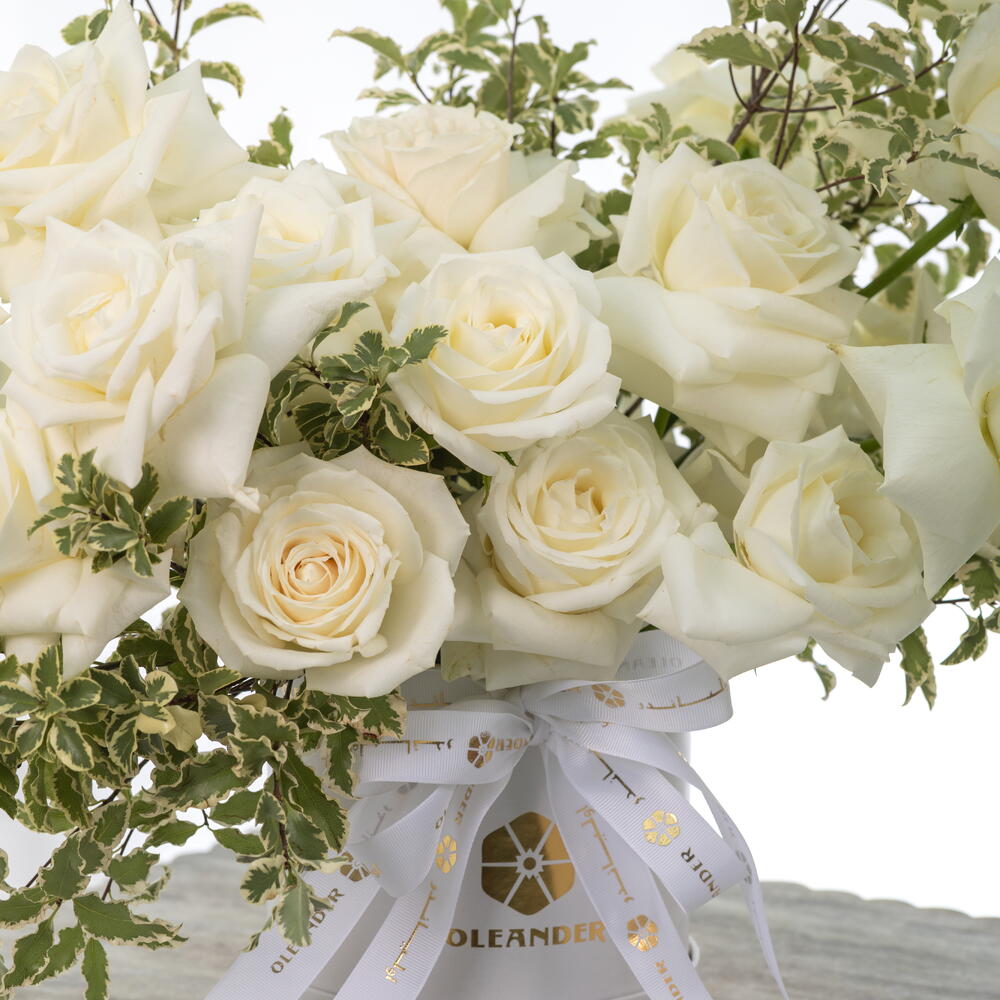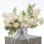 A refined expression of natural elegance, English Garden Box Couture features premium white Ecuadorian roses delicately arranged with fresh pittosporum in a garden-style composition. Presented in a signature white Oleander box, this design reflects effortless sophistication, inspired by the timeless beauty of an English garden.