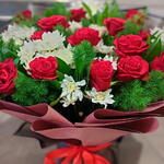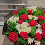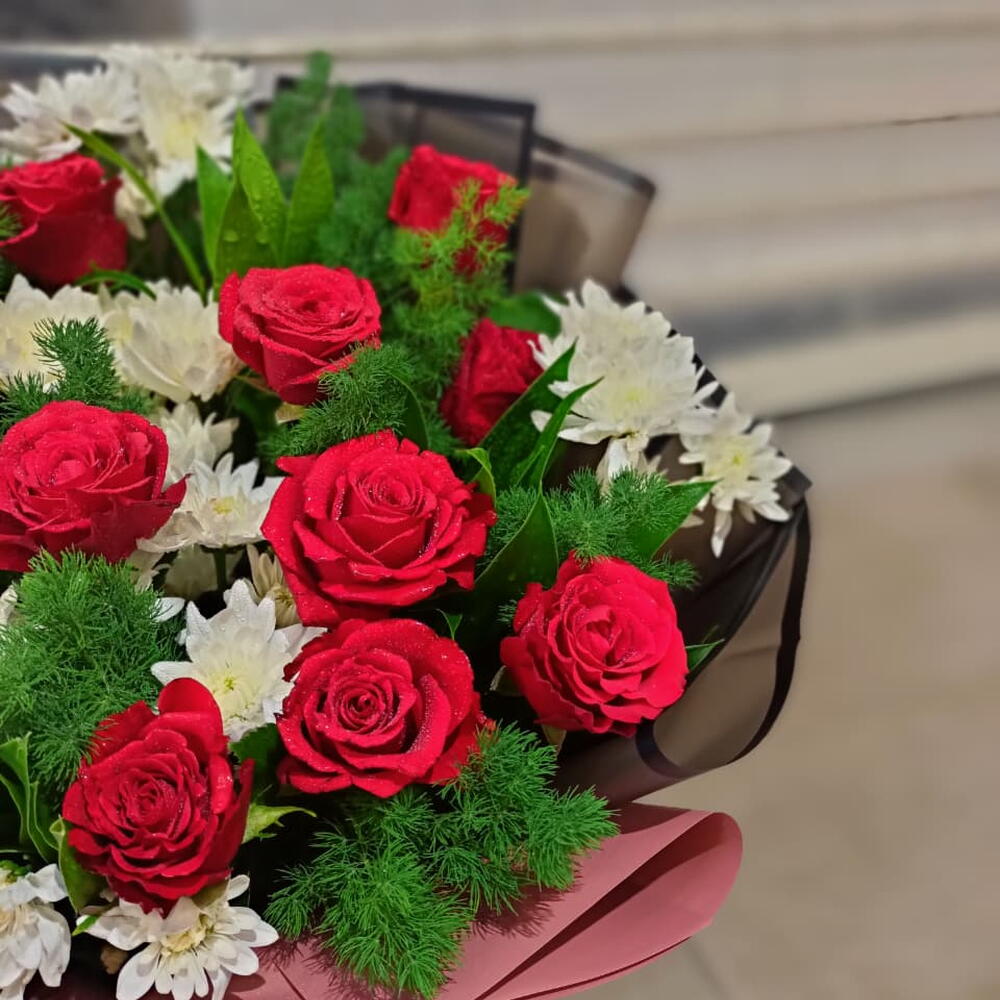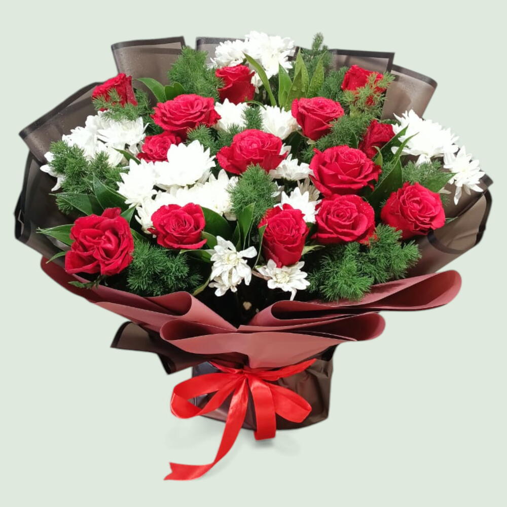 Une composition classique saisissante de roses rouges éclatantes et de chrysanthèmes d'un blanc immaculé, parfaitement encadrée par un feuillage sombre et enveloppée de tons contrastés élégants.