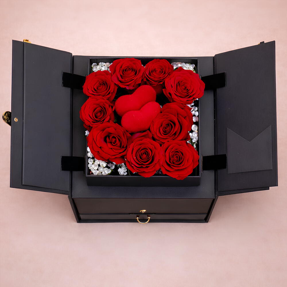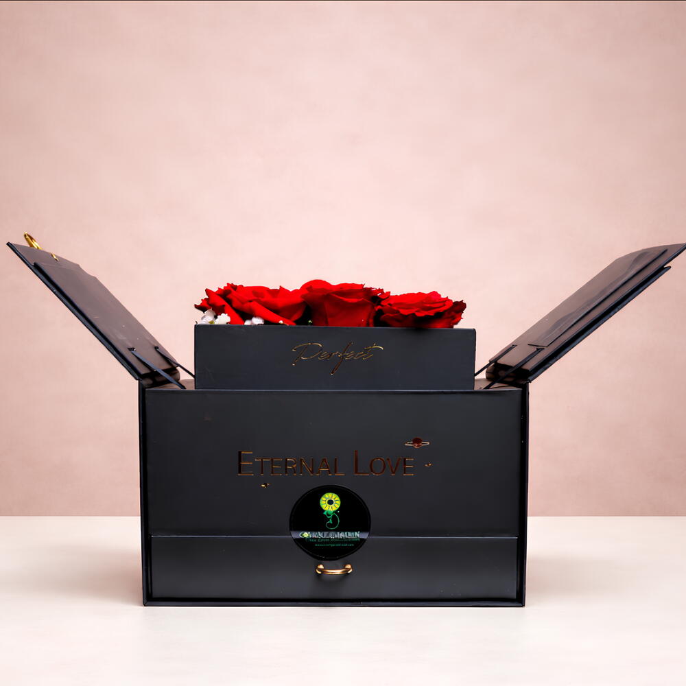 Exprimez votre amour éternel avec cette magnifique composition de 12 roses rouges éclatantes, présentée dans une boîte en forme de cœur. Parfait pour les anniversaires, la Saint-Valentin ou toute occasion où vous souhaitez exprimer votre plus profonde affection. Laissez ces roses symboliser le lien intemporel qui vous unit à votre être cher.