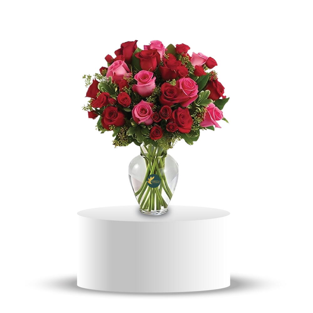Sublimez votre façon d'offrir avec notre exquis Romantic Vase. Cette composition intemporelle est une parfaite expression d'affection, idéale pour les occasions spéciales. - La composition est livrée avec un vase en verre precia - 10 roses rouges, - 10 roses roses, - 40 mini-roses rouges, - 4 pittosporums, - 6 solidagos