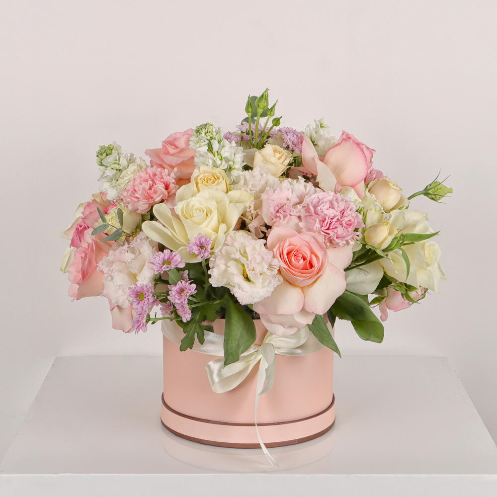 Coffret Eternal Love de Roses and Baby Roses en blanc et pêche avec la fleur de Matthiola et la fleur d'œillet donnant à la boîte des couleurs vives et merveilleuses dans un bel arrangement qui indique l'amour et le soin, avec l'ajout de la fleur de chrysanthème Santini pour que vous ayez une belle et douce boîte en cadeau pour une personne chère à votre cœur.