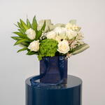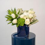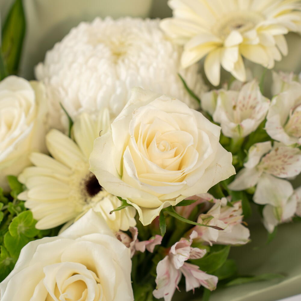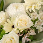 Gypsophila - 1 pce alstroemeria white - 3 pce hortensia vert - 1 pce Chanson de l'Inde - 1 pce gerbera blanche - 2 pce déco blanche - 1 pce rose Athéna blanche - 6 pce