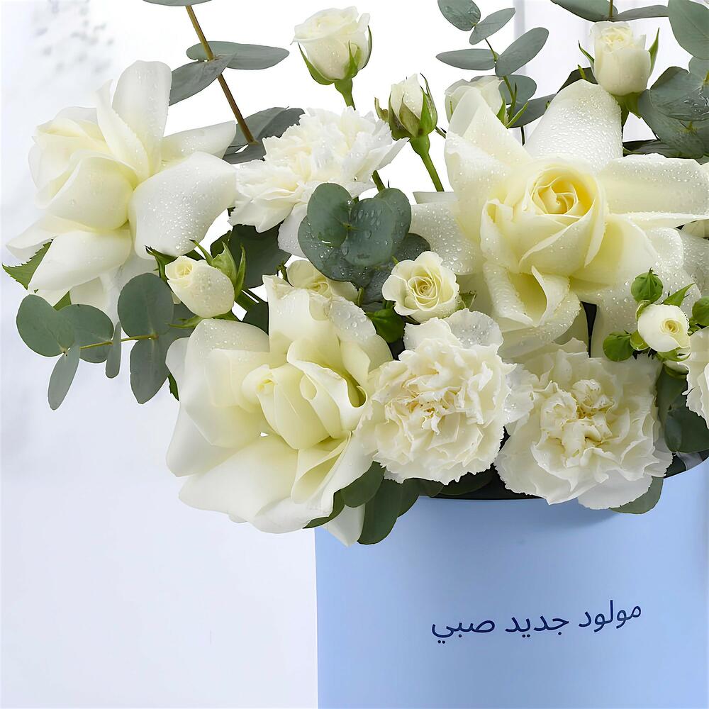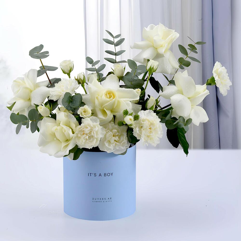 Célébrez l'arrivée d'un bébé garçon avec cette élégante boîte florale aux tons blancs sereins. Composée de roses, d'œillets et de délicates roses spray, rehaussée d'eucalyptus frais, c'est le cadeau parfait pour exprimer joie, pureté et chaleureuses félicitations. ✨ Veuillez noter : La boîte de cet arrangement peut être personnalisée dans différentes couleurs sur demande. Options disponibles : Blanc, Sable désertique, Thème Sable, Thème Rouge, Thème Noir et Noir.