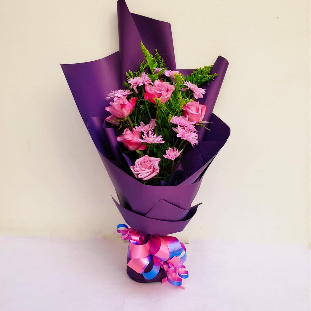 chrysanthème violet - 2 pce mix de roses roses et violettes - 5 pce solidasters - 6 pce