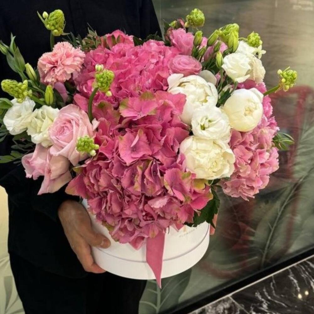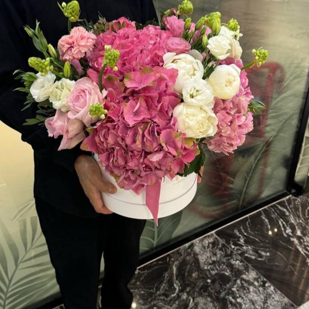 Composition : Mélange d'hortensias - 5, Pivoines blanches importées - 3, Lisianthus - 5, Ornithogalum - 10, Mélange d'œillets - 1, Rose Ohara rose - 5, Boîte ronde de marque - 1. Dimensions : Largeur - 30 cm ; Hauteur - 30 cm ; Longueur - 30 cm (emballage compris) Dimensions : 30 x 30 x 30 cm