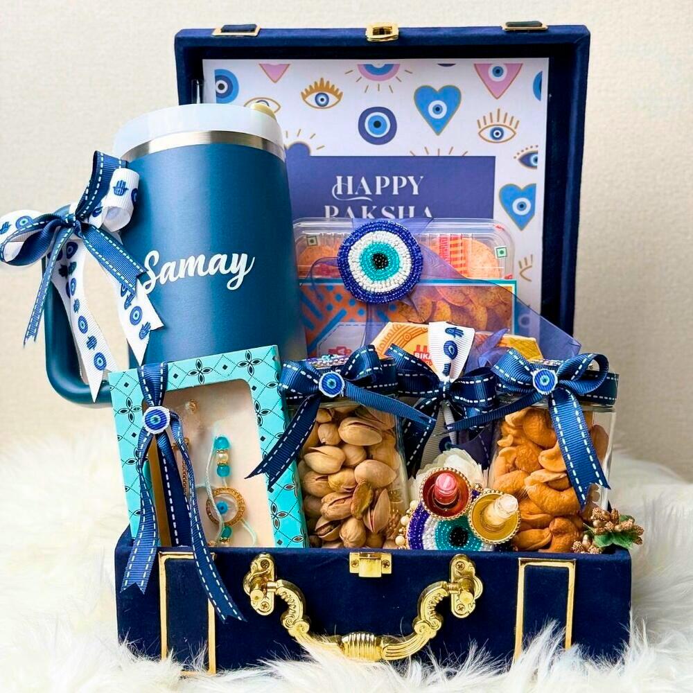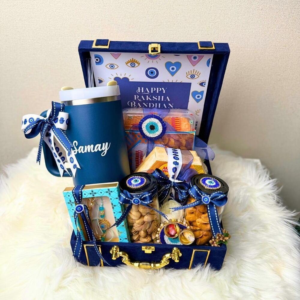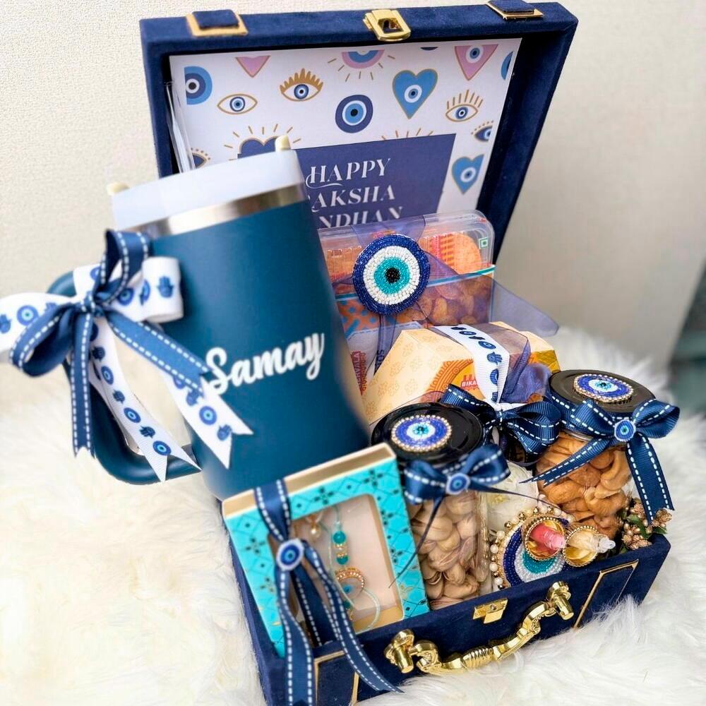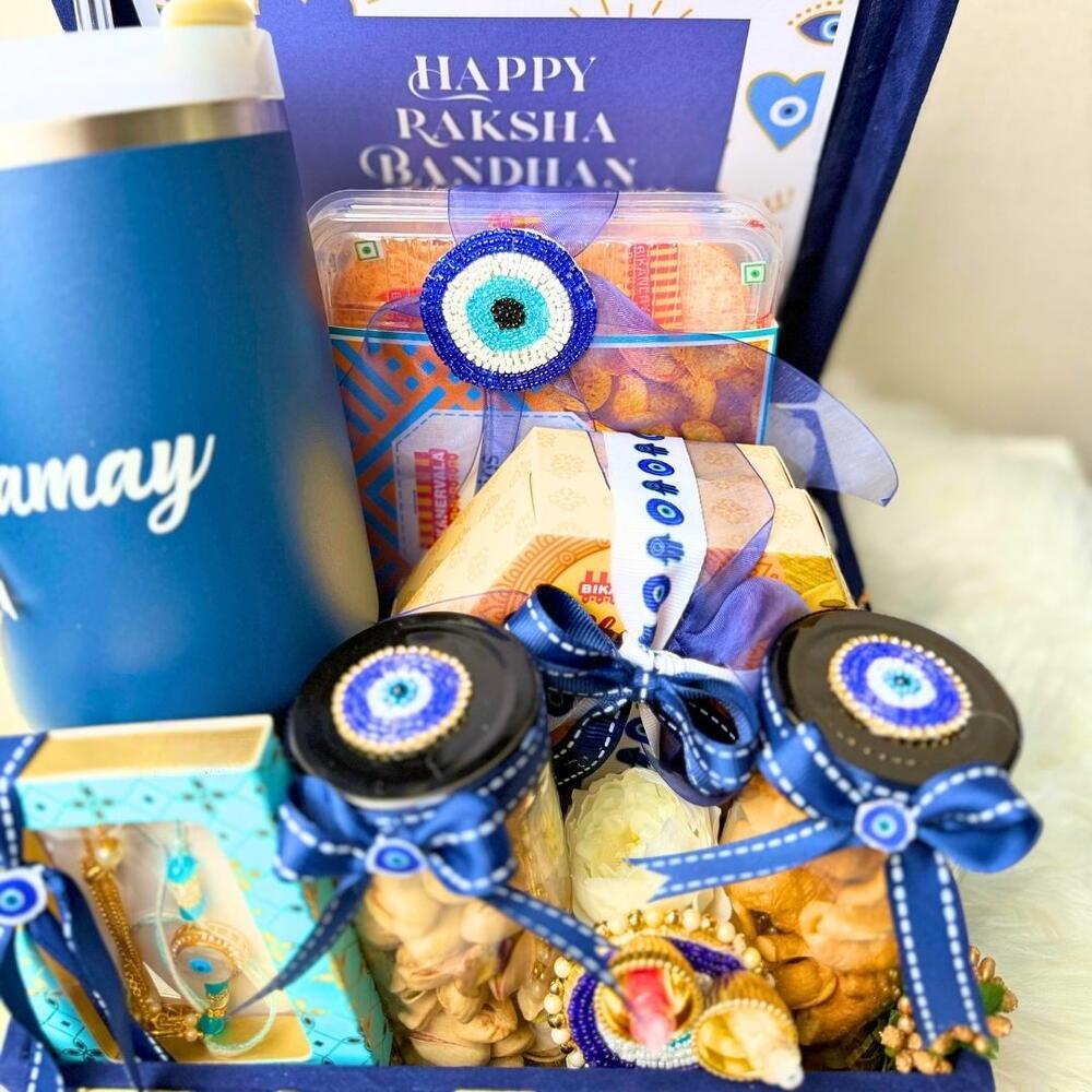 gobelet personnalisé - 1 pce ensemble rakhi mauvais œil avec roli tika - 1 pce bocaux de fruits à coque - 2 pce bikanerwala chips - 1 pce ghewar de bikanerwala - 1 pce