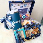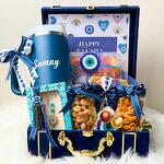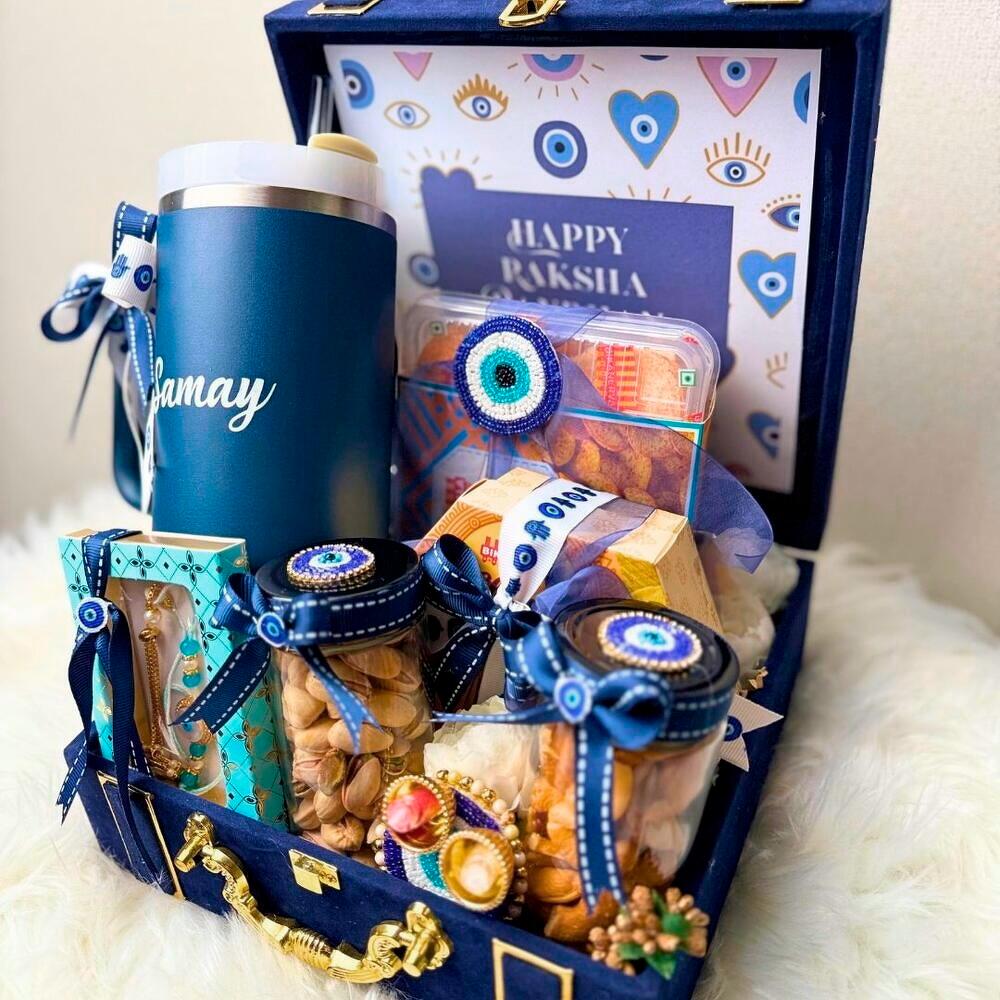 Célébrez les traditions avec style et attention grâce à ce luxueux coffret festif. Élégamment emballé dans une boîte style coffre en velours aux accents dorés, il comprend un gobelet personnalisé, un ensemble de rakhi MOP Evil Eye avec roli tika, des bocaux de fruits à coque de première qualité, des chips croquantes Bikanerwala et la douceur authentique du ghewar Bikanerwala. Chaque article est soigneusement choisi pour allier tradition, saveur et élégance moderne — faisant de ce coffret le cadeau parfait pour Raksha Bandhan ou d'autres célébrations festives. Le gobelet personnalisé ajoute une touche unique, tandis que l'ensemble de rakhi porte des bénédictions de protection et d'amour. Pour garder les friandises fraîches, conservez-les dans un endroit frais et sec, à l'abri de la lumière directe du soleil. Ce coffret est plus qu'un cadeau — c'est une expérience festive complète enveloppée d'élégance. 🎁✨