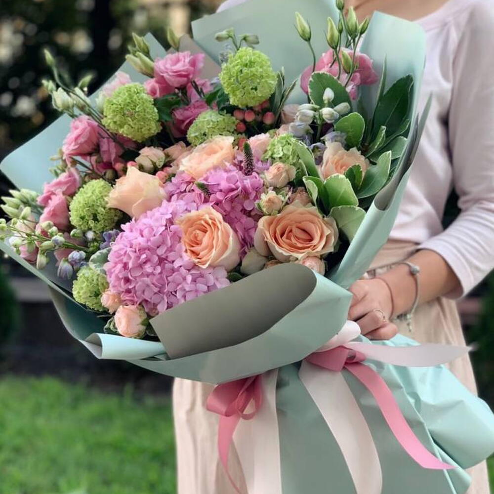Composition : Hortensia - 1, Véronique - 2, Rose Shimmer - 5, Delphinium - 3, Hypericum - 2, Pittosporum - 4, Lisianthus - 4, Rose 'Madame Bombastic' - 5, Viburnum - 2, emballage - 7, ruban - 2. Dimensions : Largeur - 40 cm ; Hauteur - 60 cm ; Longueur - 60 cm (emballage compris). Dimensions : 40 x 60 x 60 cm