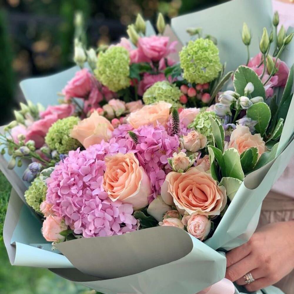 Composition : 1 hortensia, 2 véroniques, 5 roses scintillantes, 3 delphiniums, 2 hypericums, 4 pittosporums, 4 lisianthus, 5 rosiers Madame Bombastic, 2 viornes, 7 emballages, 2 rubans. Dimensions : largeur 40 cm ; hauteur 60 cm ; longueur 60 cm (emballage inclus). Dimensions : 40 x 60 x 60 cm.