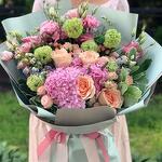 Véronique - 2 pce Ribbon - 2 pce Hydrangea - 1 pce Viorne - 2 pce Lisianthus - 4 pce Wrapping - 7 pce hypericum - 2 pce delphinium - 3 pce pittosporum - 4 pce rose scintillante - 5 pce spray de roses madame bombastic - 5 pce