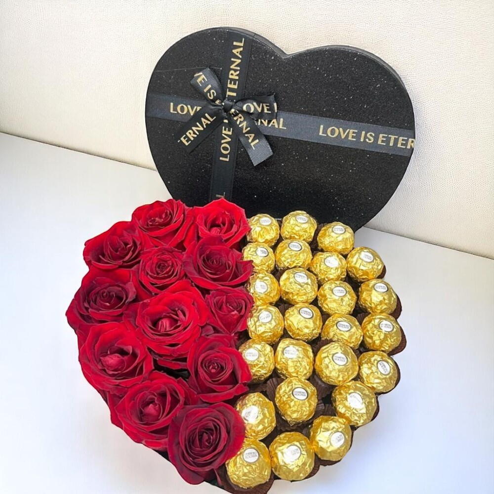 Alliance parfaite de romantisme et de gourmandise, le coffret cadeau « Élégance Chérie » est conçu pour éblouir et ravir. Confectionné dans une élégante boîte en forme de cœur, il est orné d'une moitié de roses rouges luxuriantes, symbole d'amour profond et de passion, tandis que l'autre moitié est remplie de chocolats Ferrero Rocher enveloppés d'or pour une gourmandise luxueuse. Son élégant coffret noir, orné de rubans « L'amour est éternel », rend ce cadeau aussi mémorable que les émotions qui le sous-tendent. Idéal pour la Saint-Valentin, les anniversaires ou les surprises romantiques, ce coffret capture l'essence de l'amour dans ses moindres détails. Une célébration visuelle et sensorielle : élégante, pleine de sens et d'une douceur irrésistible. Offrez un cadeau qui dit : « Tu es tout pour moi ».