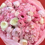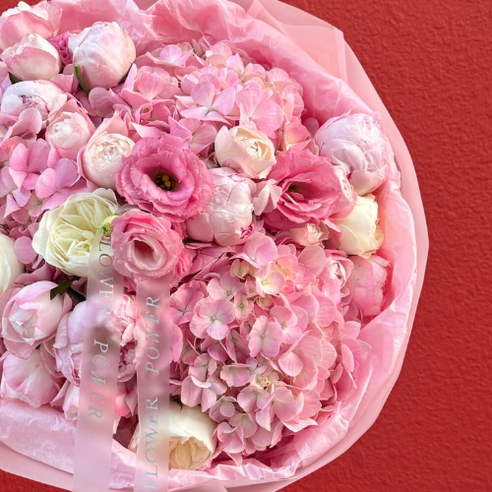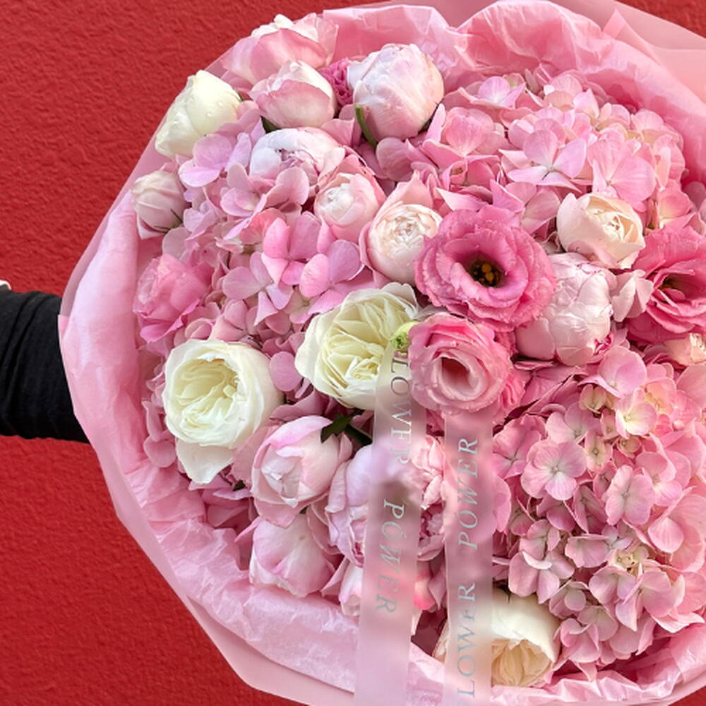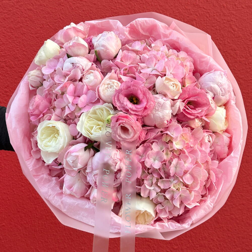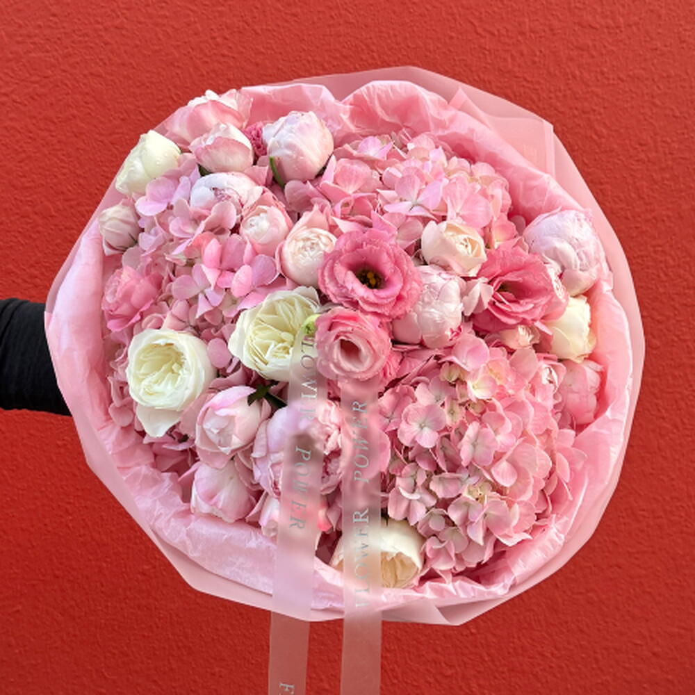 Poème floral: Bouquet d'hortensias roses, d'eustomas, de pivoines et de roses