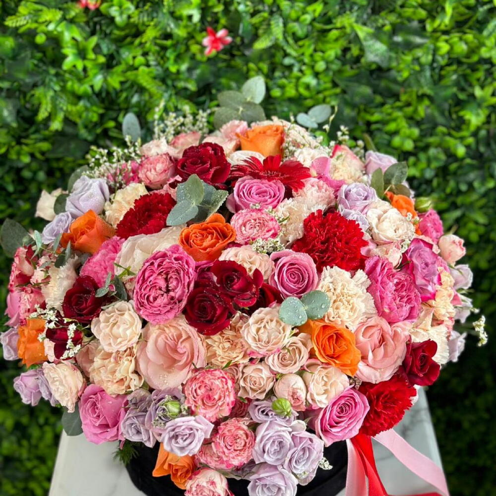 Limonium - 3 pce Pink rose - 5 pce œillet rouge - 7 pce orange rose - 5 pce rose pêche - 5 pce œillet pêche - 7 pce boîte à fleurs noire - 1 pce feuilles - 3 pce mini-roses multicolores - 15 pce