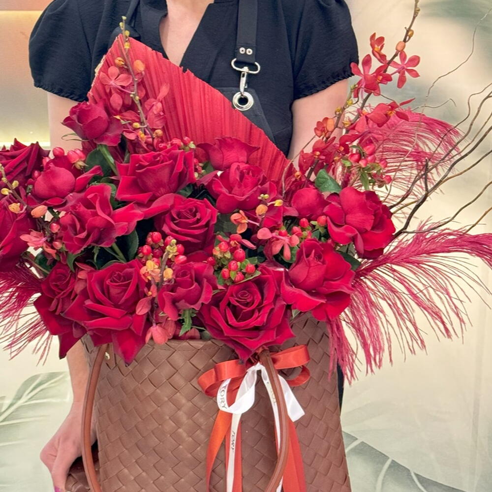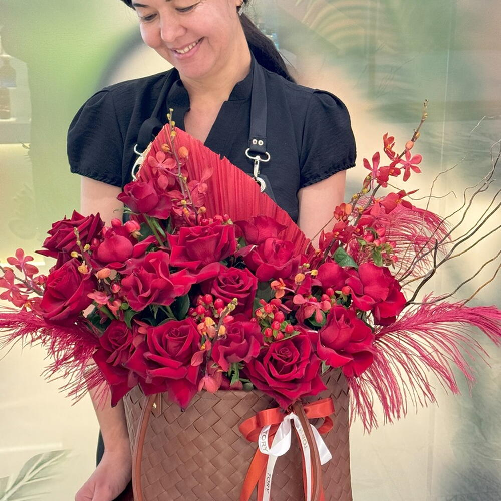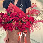 Composition : Rose rouge - 17, Eucalyptus - 3, Vanda - 8, Hypericum - 5, Palmier séché - 1, Sac - 1. Dimensions : Largeur - 40 cm ; Hauteur - 45 cm ; Longueur - 45 cm (emballage compris). Dimensions : 40 x 45 x 45 cm