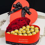 Une boîte en forme de cœur Ferrerro Rocher symbolise l'amour, le luxe et l'indulgence, combinant le geste romantique de la forme de cœur avec de riches chocolats dorés, souvent accompagnée de roses rouges pour signifier une affection profonde, ce qui en fait un cadeau populaire pour la Saint-Valentin, les anniversaires ou simplement pour montrer à quelqu'un qu'on le chérit. C'est une façon classique et élégante d'exprimer «Je t'aime» ou une profonde reconnaissance à travers une friandise et une belle présentation.