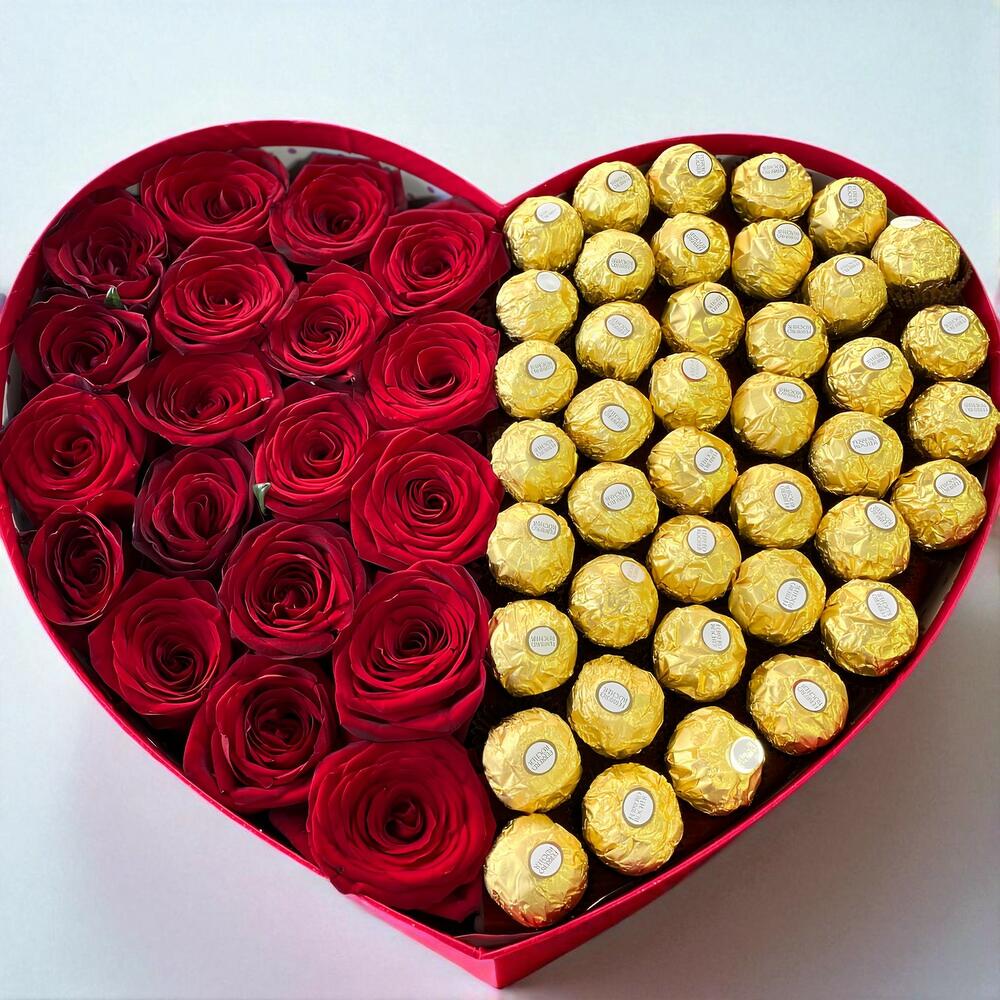 25 roses rouges avec 30 à 35 chocolats Ferrero Rocher dans une boîte en forme de cœur rouge artisanale