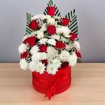 Red rose - 15 pce Chrysanthemum - 10 pce White rose - 5 pce gypsophile - 5 pce