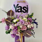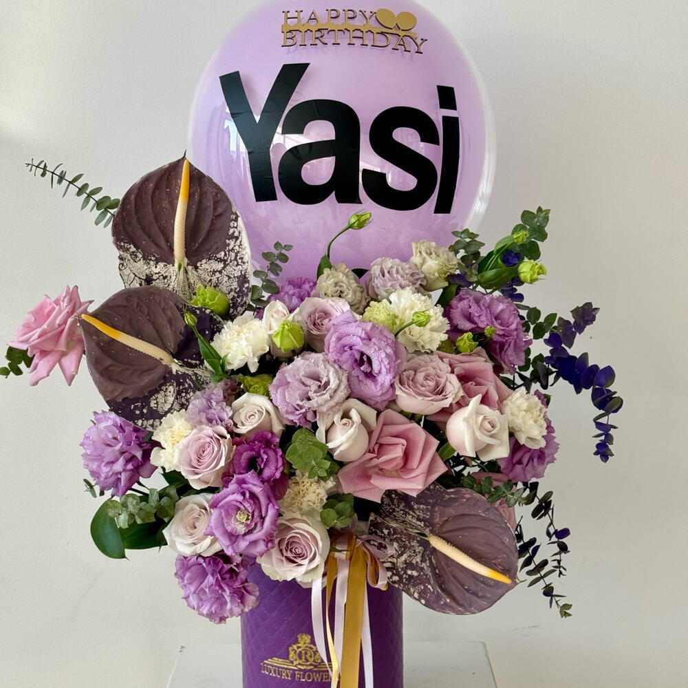 Anthurium - 3 pce Lisianthus - 10 pce roses violettes - 10 pce verdure - 5 pce