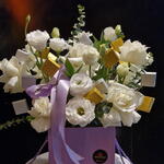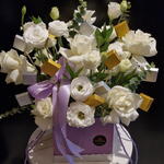 rose blanche - 12 pce feuilles de rascuss - 5 pce lisyanthus blanc - 5 pce ucalyptus - 5 pce chocolats kunafa - 10 pce lait et noix chocolats - 5 pce