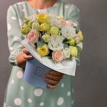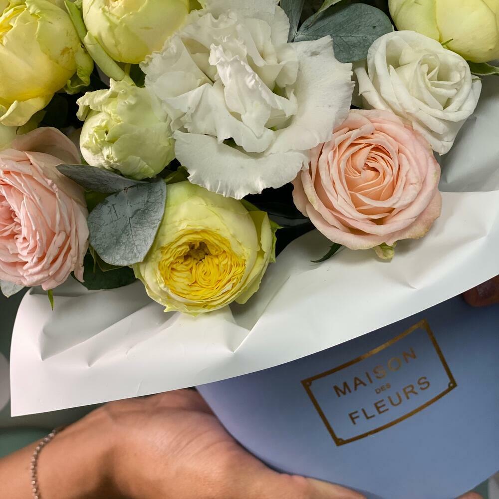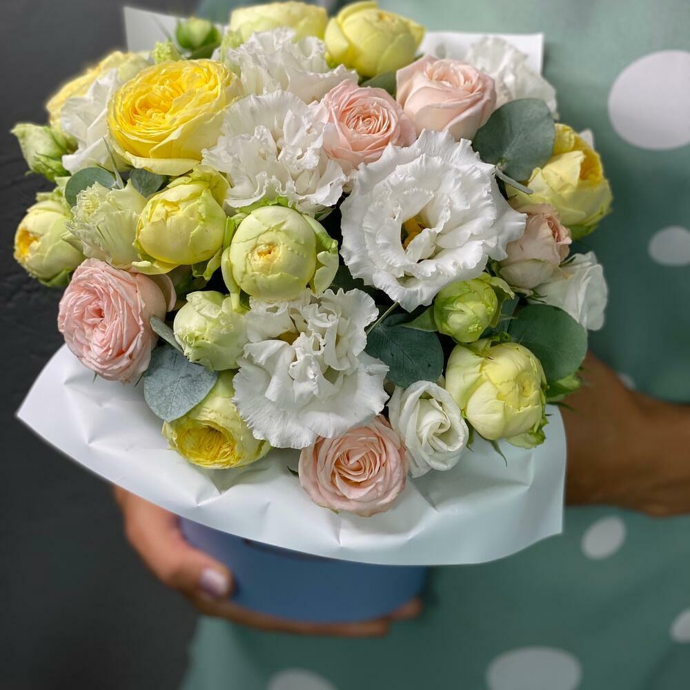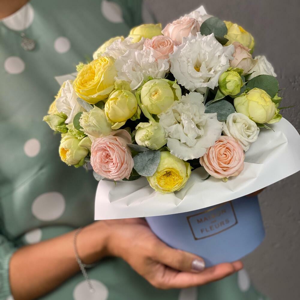 Fleurs dans une boîte design: pivoines, roses et eucalyptus parfumé-5991