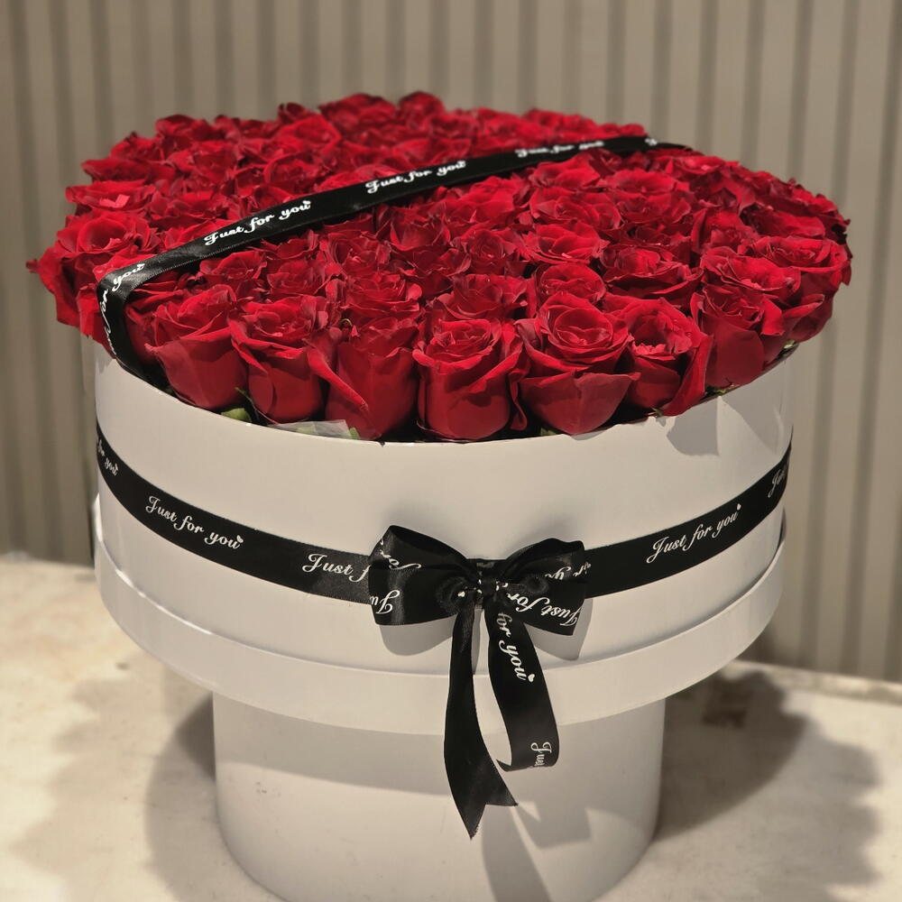 101 roses rouges disposées dans une boîte en cuir blanc, ornée d'un ruban portant l'inscription «Joyeux anniversaire». Un cadeau d'anniversaire parfait avec une présentation luxueuse.