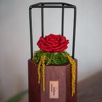 Boîte hexagonale avec rose rouge stabilisée et jardin vert